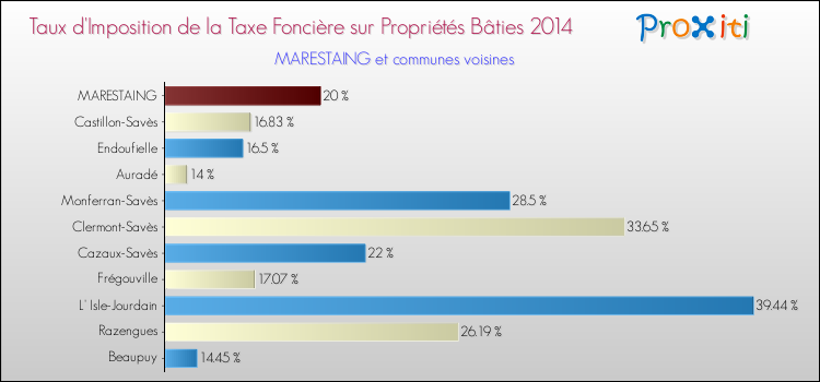 En 2014, le taux de la taxe foncière sur le bâti vôté par le conseil municipal de Marestaing était de : 20 %.