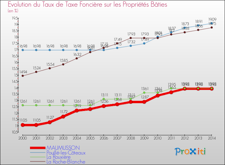 A Maumusson, le taux de taxe foncière sur le bâti a donc augmenté de 25.97 % entre 2000 et 2014.