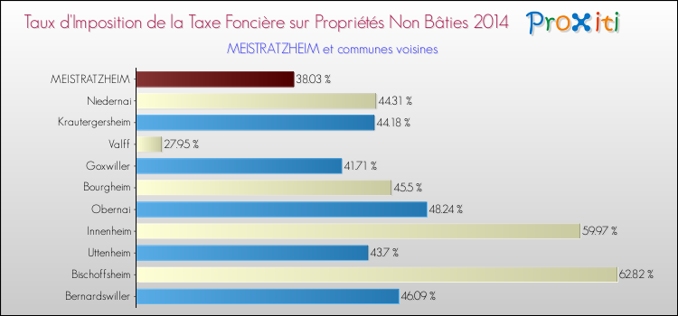 En 2014, le taux de la taxe foncière sur le non bâti vôté par le conseil municipal de Meistratzheim était de : 38.03 %.