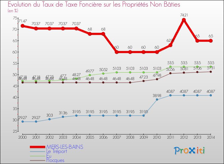 Pendant la même période, les communes françaises similaires à Mers-les-Bains, ont vu leur taux de taxe foncière sur le non bâti augmenter de 3.36 % en moyenne entre 2000 et 2014.