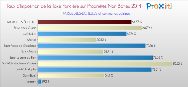 En 2014, le taux de la taxe foncière sur le non bâti vôté par le conseil municipal de Miribel-les-Échelles était de : 64.67 %.