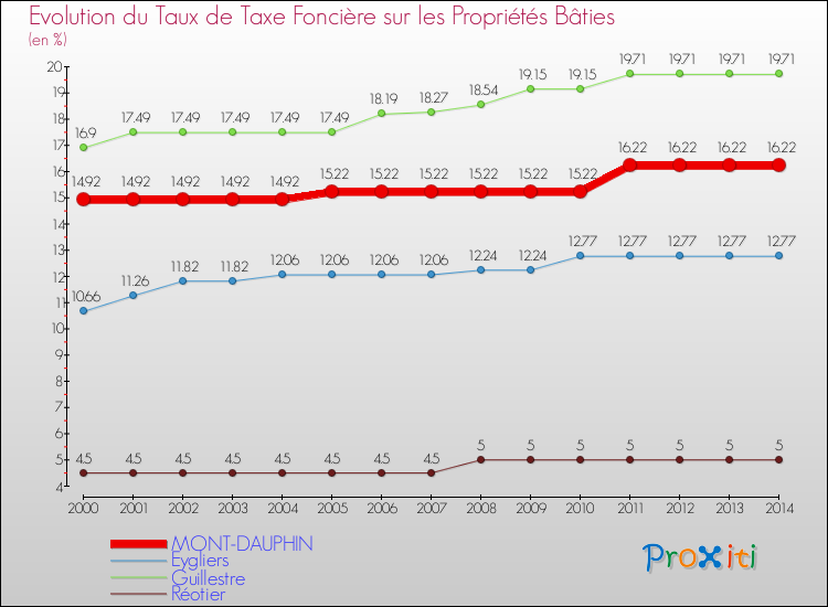 A Mont-Dauphin, le taux de taxe foncière sur le bâti a donc augmenté de 8.71 % entre 2000 et 2014.