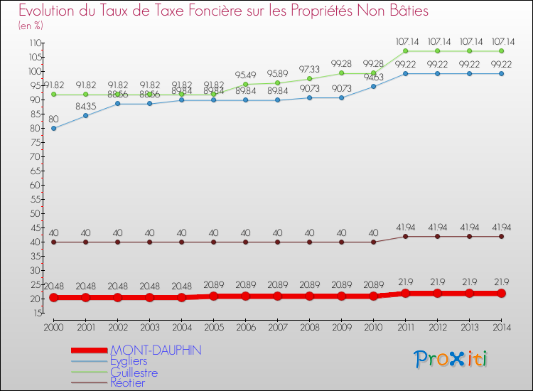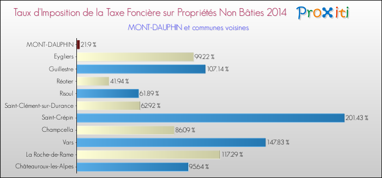 En 2014, le taux de la taxe foncière sur le non bâti vôté par le conseil municipal de Mont-Dauphin était de : 21.9 %.