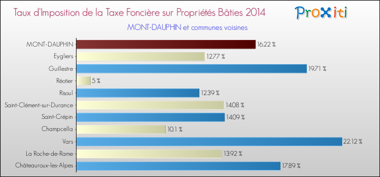 En 2014, le taux de la taxe foncière sur le bâti vôté par le conseil municipal de Mont-Dauphin était de : 16.22 %.