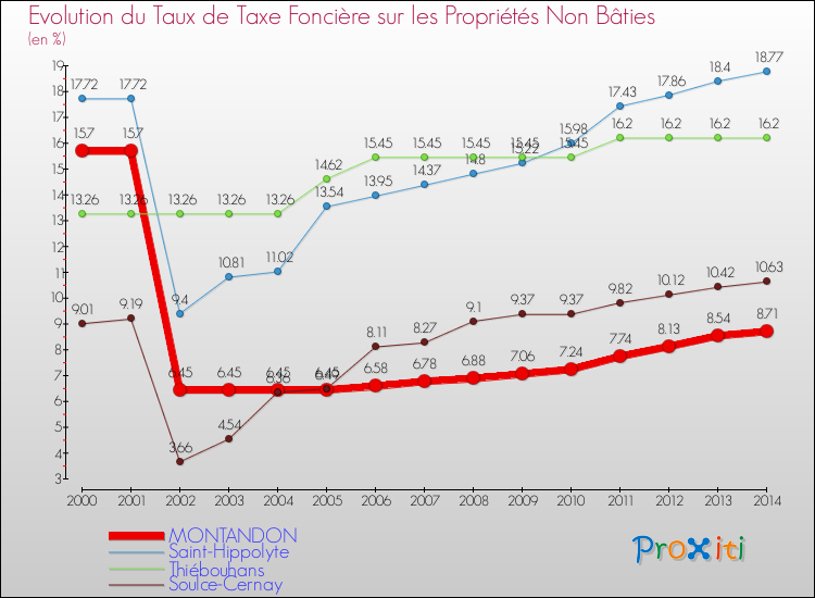 Pendant la même période, les communes françaises similaires à Montandon, ont vu leur taux de taxe foncière sur le non bâti baisser de 13.3 % en moyenne entre 2000 et 2014.