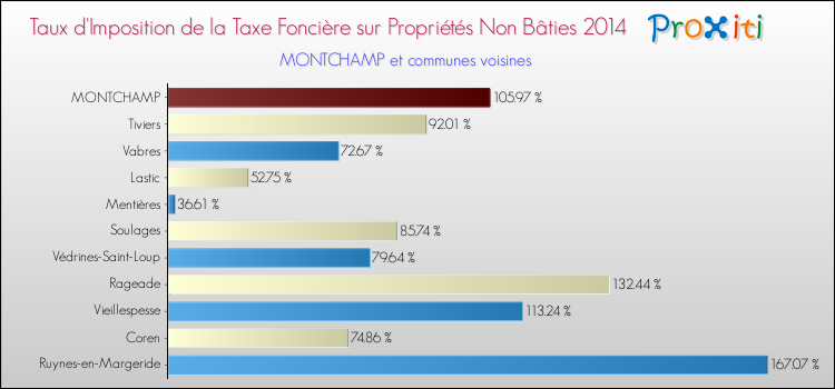 Vous trouverez ci-dessous des graphiques qui vous permettent de situer le taux de la taxe foncière sur le non bâti de Montchamp par rapport aux communes voisines.
