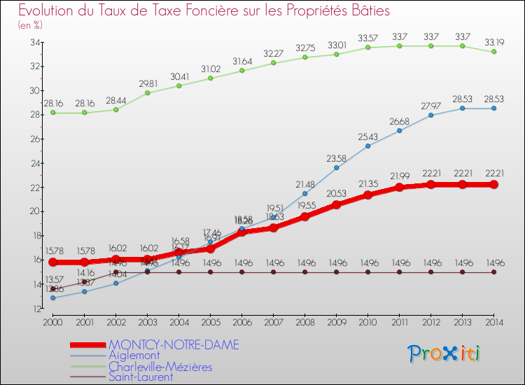 Pendant la même période, les communes françaises similaires à Montcy-Notre-Dame, ont vu leur taux de taxe foncière sur le bâti augmenter de 17.8 % en moyenne entre 2000 et 2014.