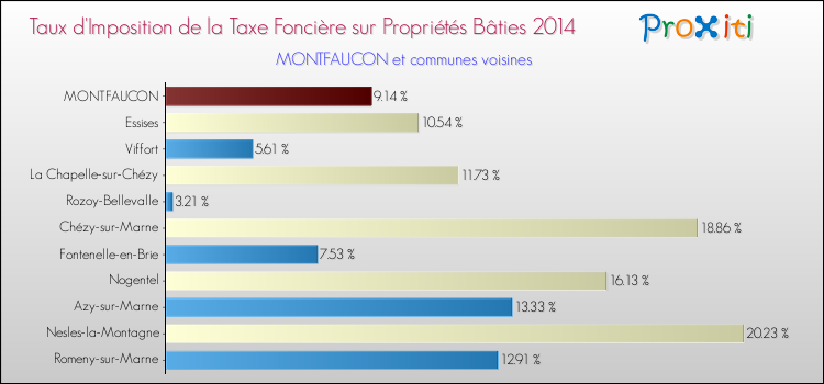 En 2014, le taux de la taxe foncière sur le bâti vôté par le conseil municipal de Montfaucon était de : 9.14 %.