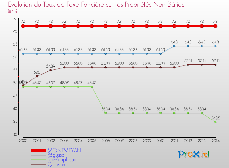 En 2014, le taux de la taxe foncière sur le non bâti vôté par le conseil municipal de Montmeyan était de : 72 %.