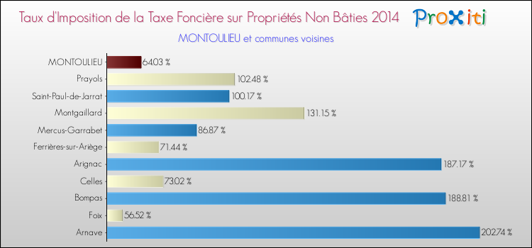 Vous trouverez ci-dessous des graphiques qui vous permettent de situer le taux de la taxe foncière sur le non bâti de Montoulieu par rapport aux communes voisines.