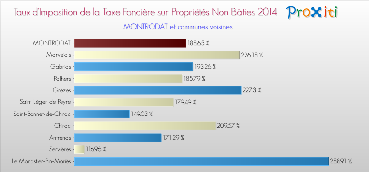En 2014, le taux de la taxe foncière sur le non bâti vôté par le conseil municipal de Montrodat était de : 188.65 %.