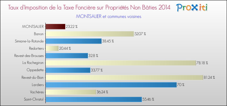 Vous trouverez ci-dessous des graphiques qui vous permettent de situer le taux de la taxe foncière sur le non bâti de Montsalier par rapport aux communes voisines.