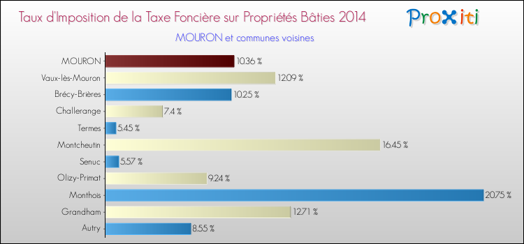 En 2014, le taux de la taxe foncière sur le bâti vôté par le conseil municipal de Mouron était de : 10.36 %.