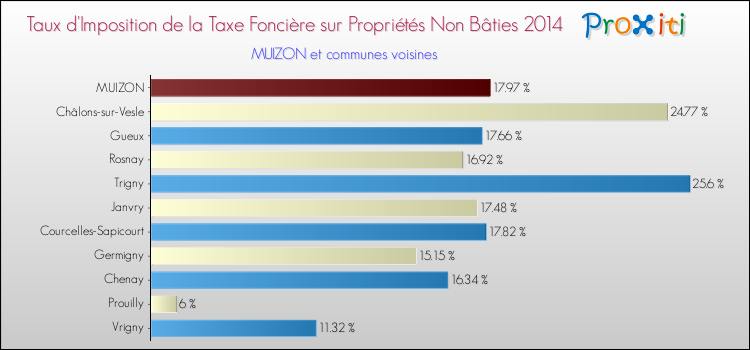 En 2014, le taux de la taxe foncière sur le non bâti vôté par le conseil municipal de Muizon était de : 17.97 %.