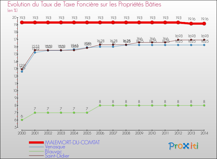En 2014, le taux de la taxe foncière sur le bâti vôté par le conseil municipal de Malemort-du-Comtat était de : 19.16 %.