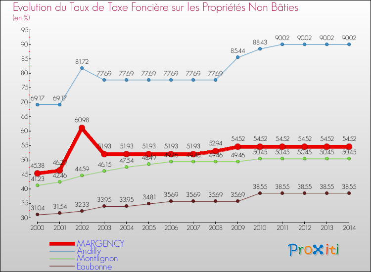 Pendant la même période, les communes françaises similaires à Margency, ont vu leur taux de taxe foncière sur le non bâti augmenter de 9.86 % en moyenne entre 2000 et 2014.