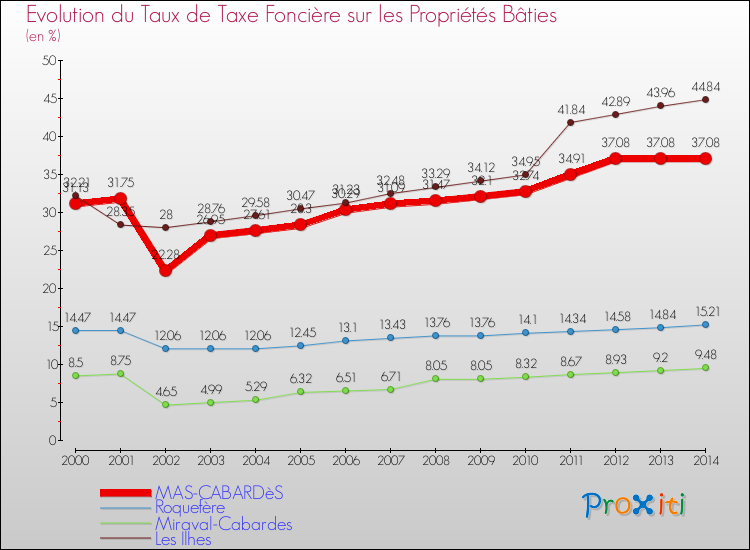 A Mas-Cabardès, le taux de taxe foncière sur le bâti a donc augmenté de 19.11 % entre 2000 et 2014.