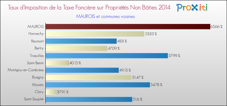 En 2014, le taux de la taxe foncière sur le non bâti vôté par le conseil municipal de Maurois était de : 65.66 %.