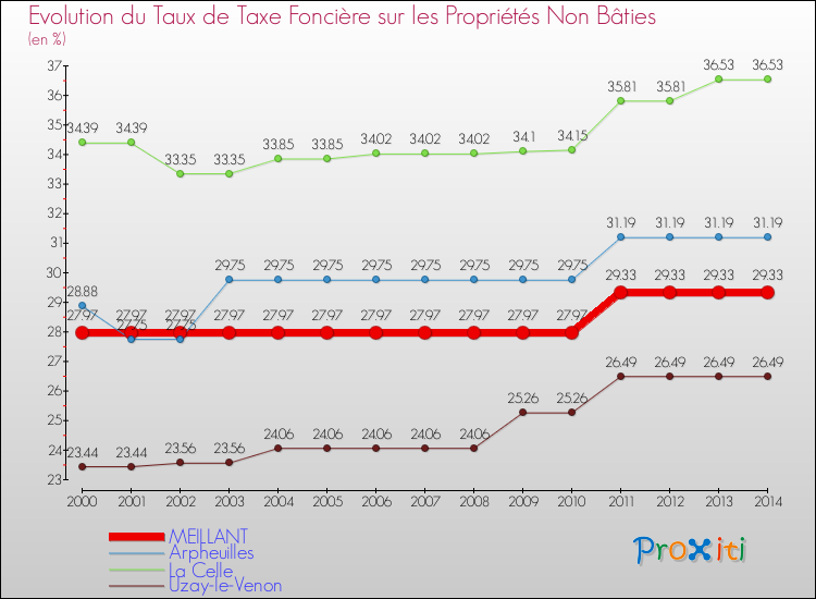 Pendant la même période, les communes françaises similaires à Meillant, ont vu leur taux de taxe foncière sur le non bâti baisser de 0.94 % en moyenne entre 2000 et 2014.