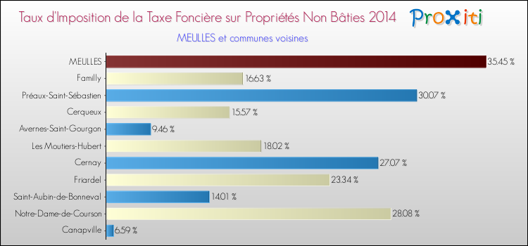 Vous trouverez ci-dessous des graphiques qui vous permettent de situer le taux de la taxe foncière sur le non bâti de Meulles par rapport aux communes voisines.
