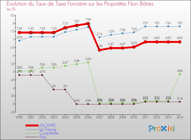 En 2014, le taux de la taxe foncière sur le non bâti vôté par le conseil municipal de Moivre était de : 6.85 %.