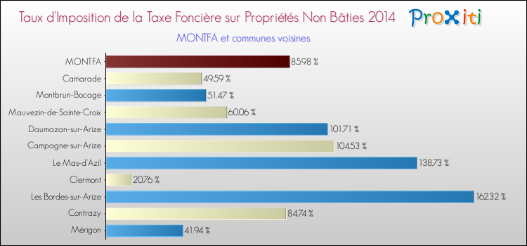 En 2014, le taux de la taxe foncière sur le non bâti vôté par le conseil municipal de Montfa était de : 85.98 %.