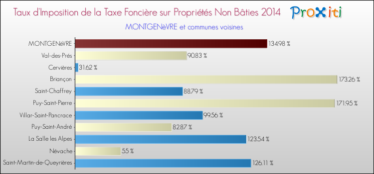 En 2014, le taux de la taxe foncière sur le non bâti vôté par le conseil municipal de Montgenèvre était de : 134.98 %.
