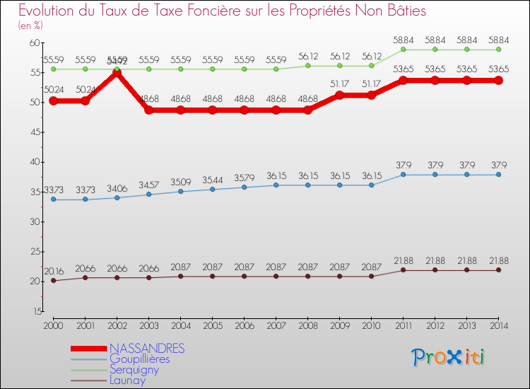Le graphique ci dessous représente l'évolution du taux de la taxe foncière sur le non bâti à Nassandres depuis 2000.