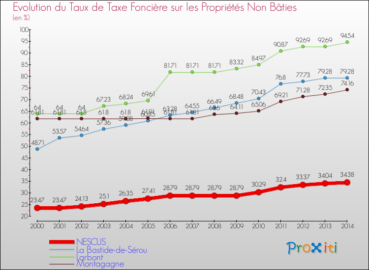 A Nescus, le taux de taxe foncière sur le non bâti a ainsi augmenté de 46.48 % entre 2000 et 2014.