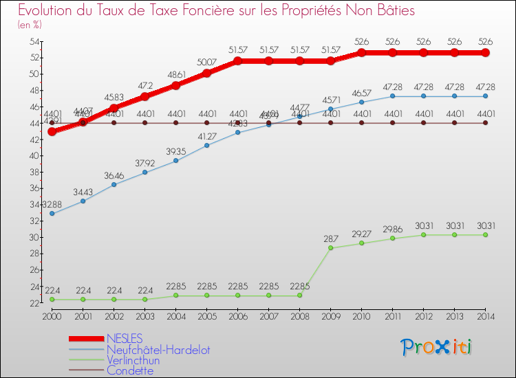 Pendant la même période, les communes françaises similaires à Nesles, ont vu leur taux de taxe foncière sur le non bâti baisser de 3.01 % en moyenne entre 2000 et 2014.