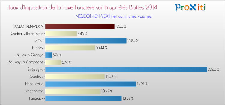 En 2014, le taux de la taxe foncière sur le bâti vôté par le conseil municipal de Nojeon-en-Vexin était de : 12.55 %.