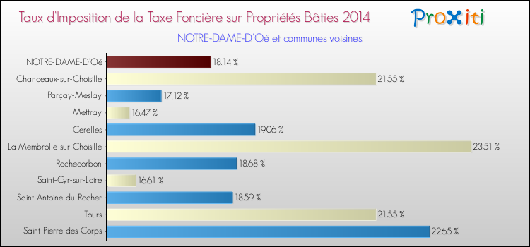Pendant la même période, les communes françaises similaires à Notre-Dame-d'Oé, ont vu leur taux de taxe foncière sur le bâti augmenter de 11.7 % en moyenne entre 2000 et 2014.