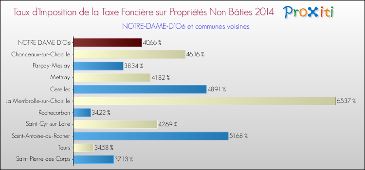 Pendant la même période, les communes françaises similaires à Notre-Dame-d'Oé, ont vu leur taux de taxe foncière sur le non bâti augmenter de 12.19 % en moyenne entre 2000 et 2014.