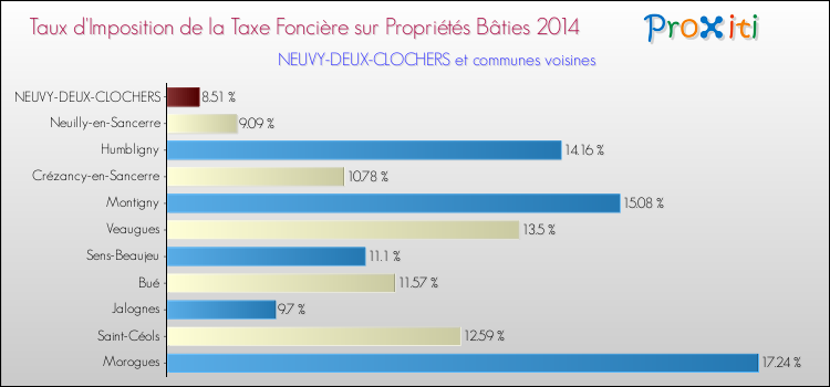 En 2014, le taux de la taxe foncière sur le bâti vôté par le conseil municipal de Neuvy-Deux-Clochers était de : 8.51 %.