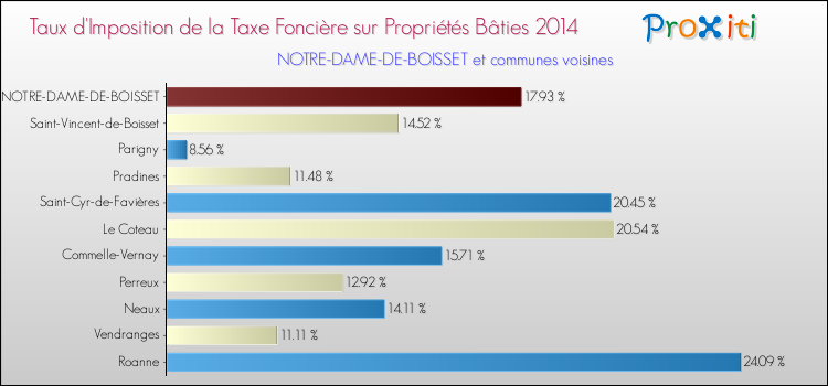 En 2014, le taux de la taxe foncière sur le bâti vôté par le conseil municipal de Notre-Dame-de-Boisset était de : 17.93 %.