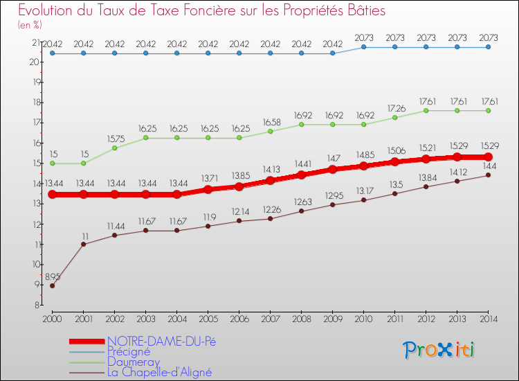 A Notre-Dame-du-Pé, le taux de taxe foncière sur le bâti a donc augmenté de 13.76 % entre 2000 et 2014.