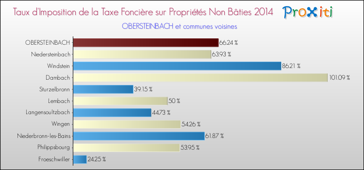 En 2014, le taux de la taxe foncière sur le non bâti vôté par le conseil municipal de Obersteinbach était de : 66.24 %.