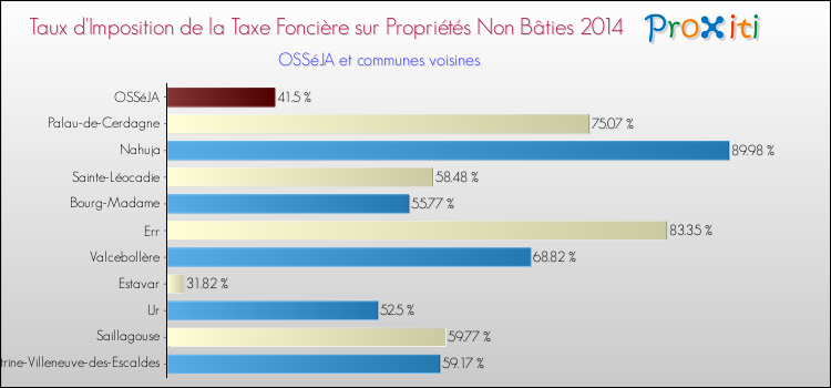 En 2014, le taux de la taxe foncière sur le non bâti vôté par le conseil municipal de Osséja était de : 41.5 %.