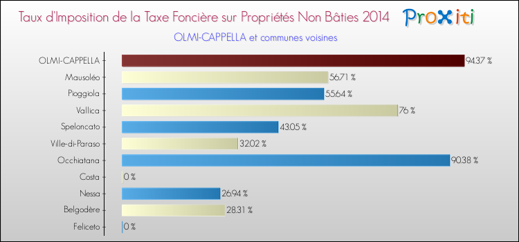 En 2014, le taux de la taxe foncière sur le non bâti vôté par le conseil municipal de Olmi-Cappella était de : 94.37 %.