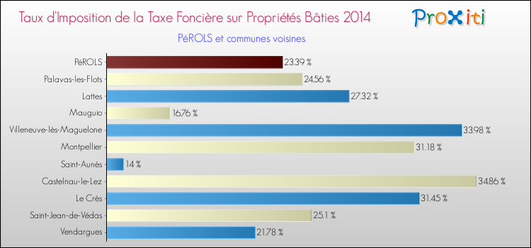 En 2014, le taux de la taxe foncière sur le bâti vôté par le conseil municipal de Pérols était de : 23.39 %.