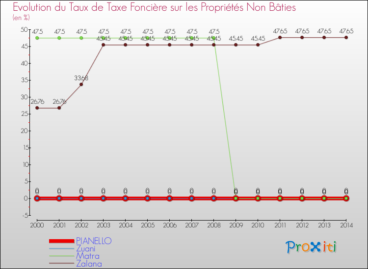 En 2014, le taux de la taxe foncière sur le non bâti vôté par le conseil municipal de Pianello était de : 0 %.