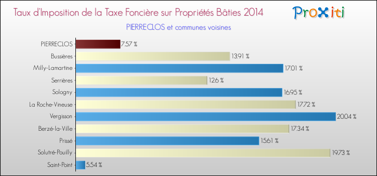 En 2014, le taux de la taxe foncière sur le bâti vôté par le conseil municipal de Pierreclos était de : 7.57 %.
