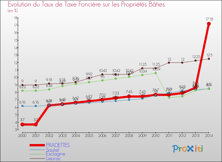 A Pradettes, le taux de taxe foncière sur le bâti a donc augmenté de 364.32 % entre 2000 et 2014.