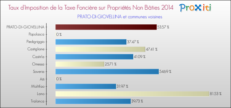 En 2014, le taux de la taxe foncière sur le non bâti vôté par le conseil municipal de Prato-di-Giovellina était de : 53.57 %.