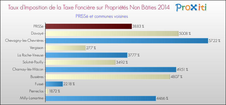En 2014, le taux de la taxe foncière sur le non bâti vôté par le conseil municipal de Prissé était de : 38.83 %.