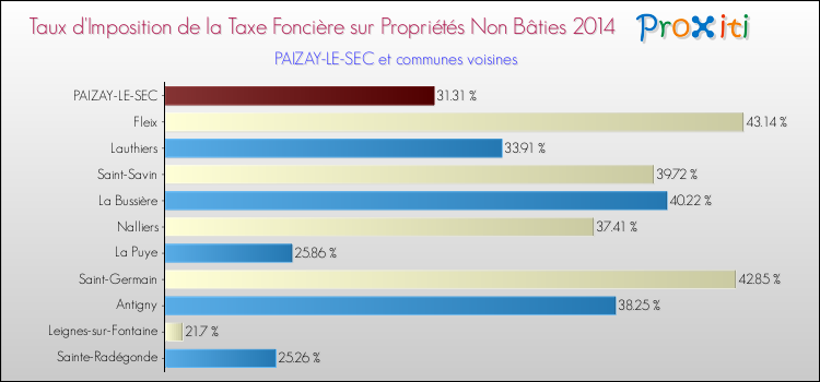 En 2014, le taux de la taxe foncière sur le non bâti vôté par le conseil municipal de Paizay-le-Sec était de : 31.31 %.