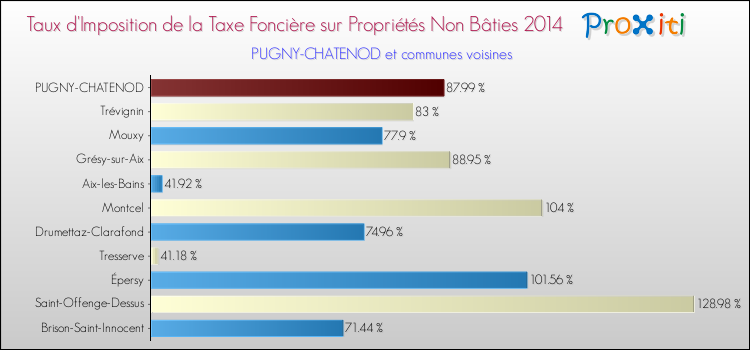 En 2014, le taux de la taxe foncière sur le non bâti vôté par le conseil municipal de Pugny-Chatenod était de : 87.99 %.