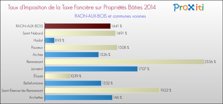 En 2014, le taux de la taxe foncière sur le bâti vôté par le conseil municipal de Raon-aux-Bois était de : 14.41 %.