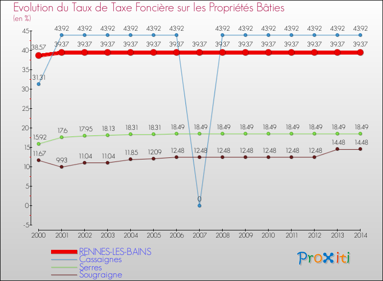 En 2014, le taux de la taxe foncière sur le bâti vôté par le conseil municipal de Rennes-les-Bains était de : 39.37 %.