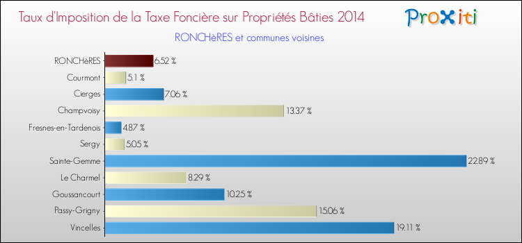 Pendant la même période, les communes françaises similaires à Ronchères, ont vu leur taux de taxe foncière sur le bâti augmenter de 7.04 % en moyenne entre 2000 et 2014.